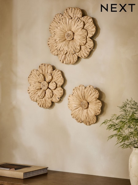 Set of 3 Neutral Woven Paper Flower Plaques Wall Art