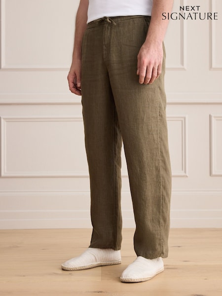 Khaki Green Relaxed Fit Signature 100% Linen Textured Trousers With Elasticated Waist