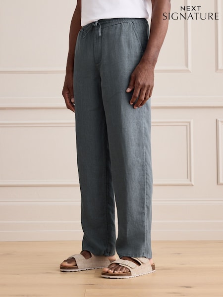 Teal Relaxed Fit Signature 100% Linen Textured Trousers With Elasticated Waist