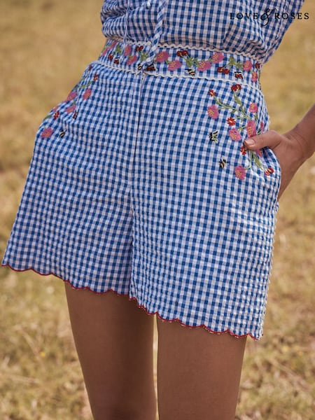 Love & Roses Blue Gingham Embroidered Summer Shorts